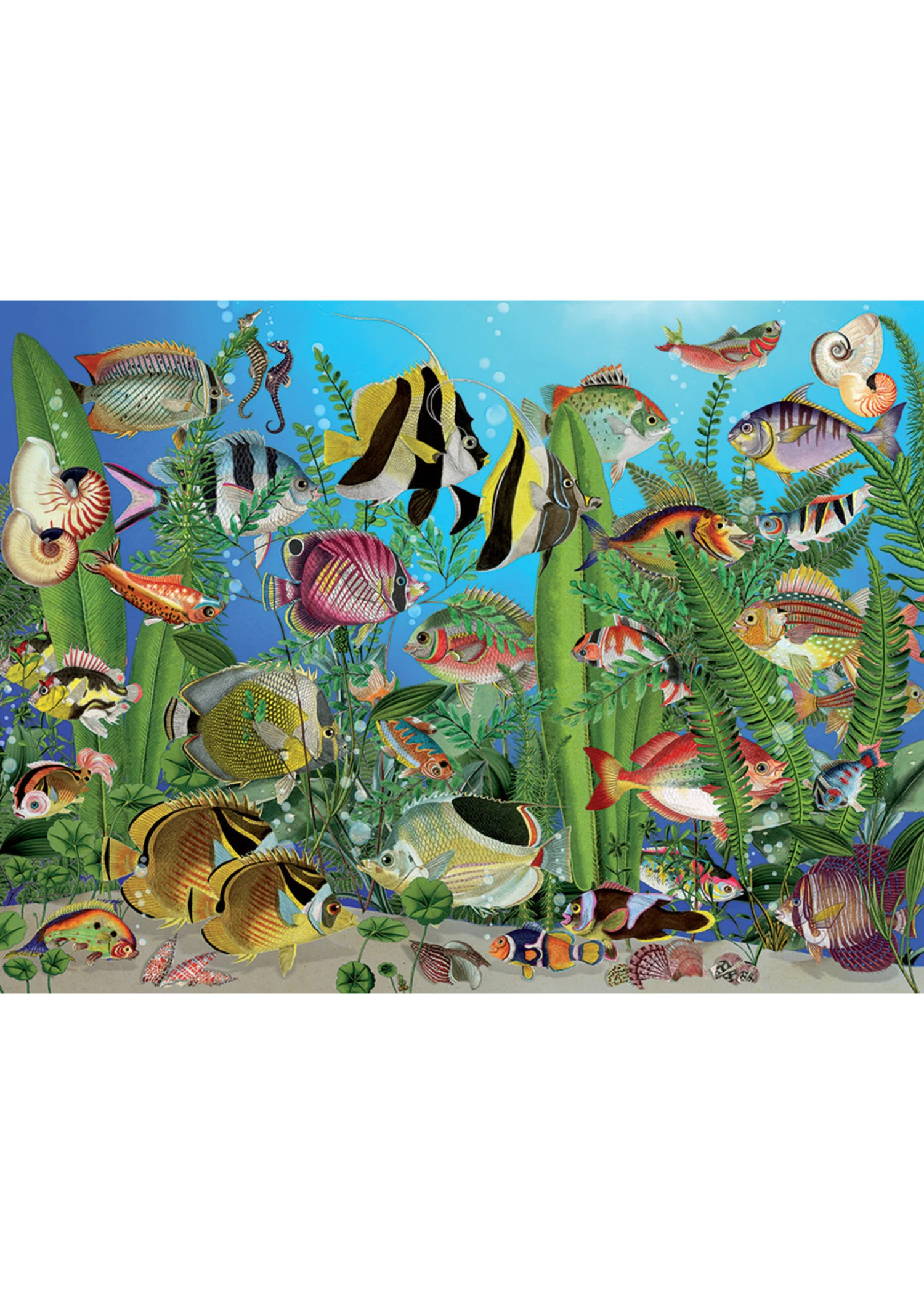 Aquarium is an Easy Handling 275 piece puzzle featuring Paul’s colourful fish moving about their faux ocean floor in all directions!