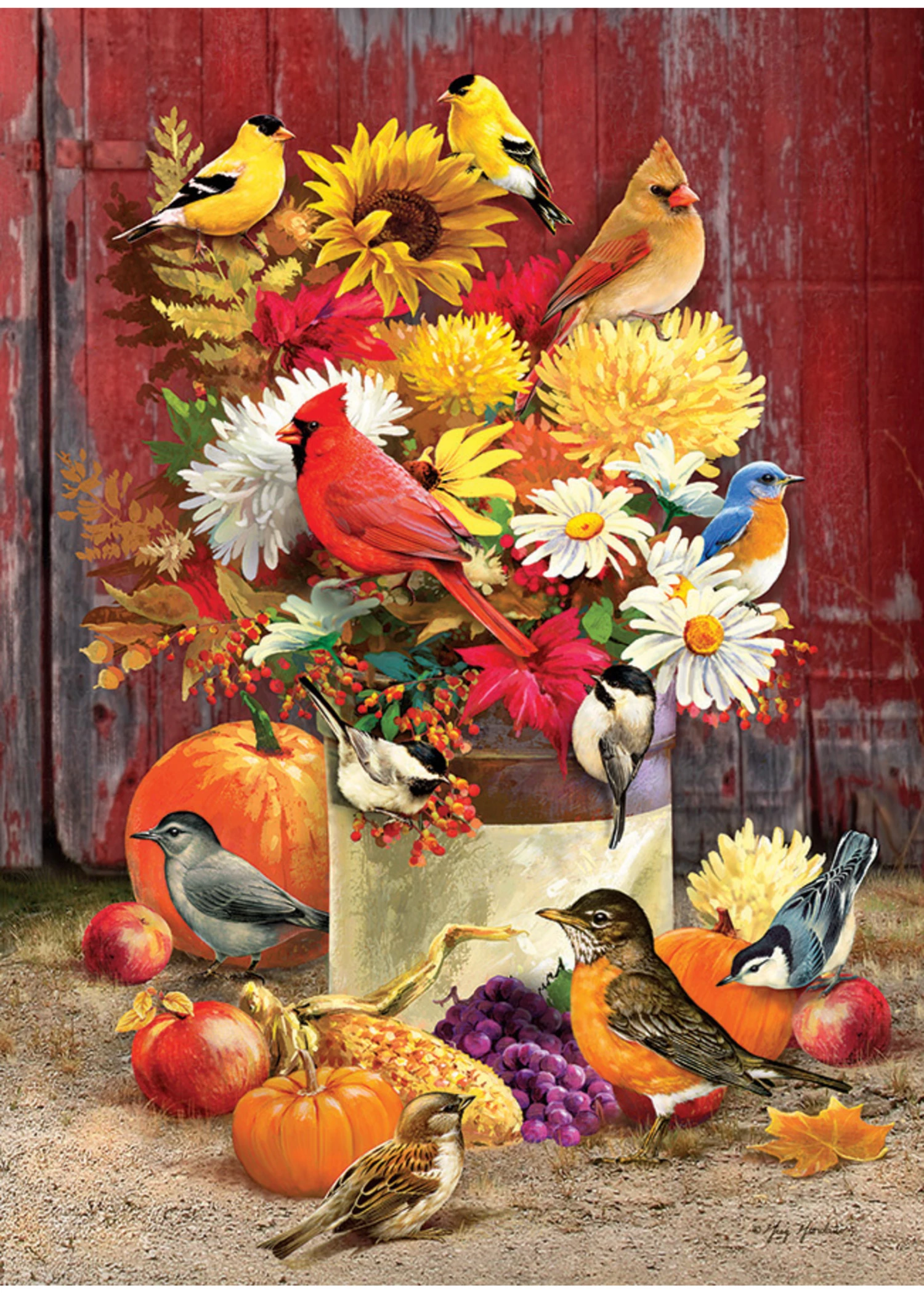 A beautiful Autumn Bouquet surrounded by pumpkins and other fruit are just the thing to attract the birds in this festive 1000 piece puzzle.