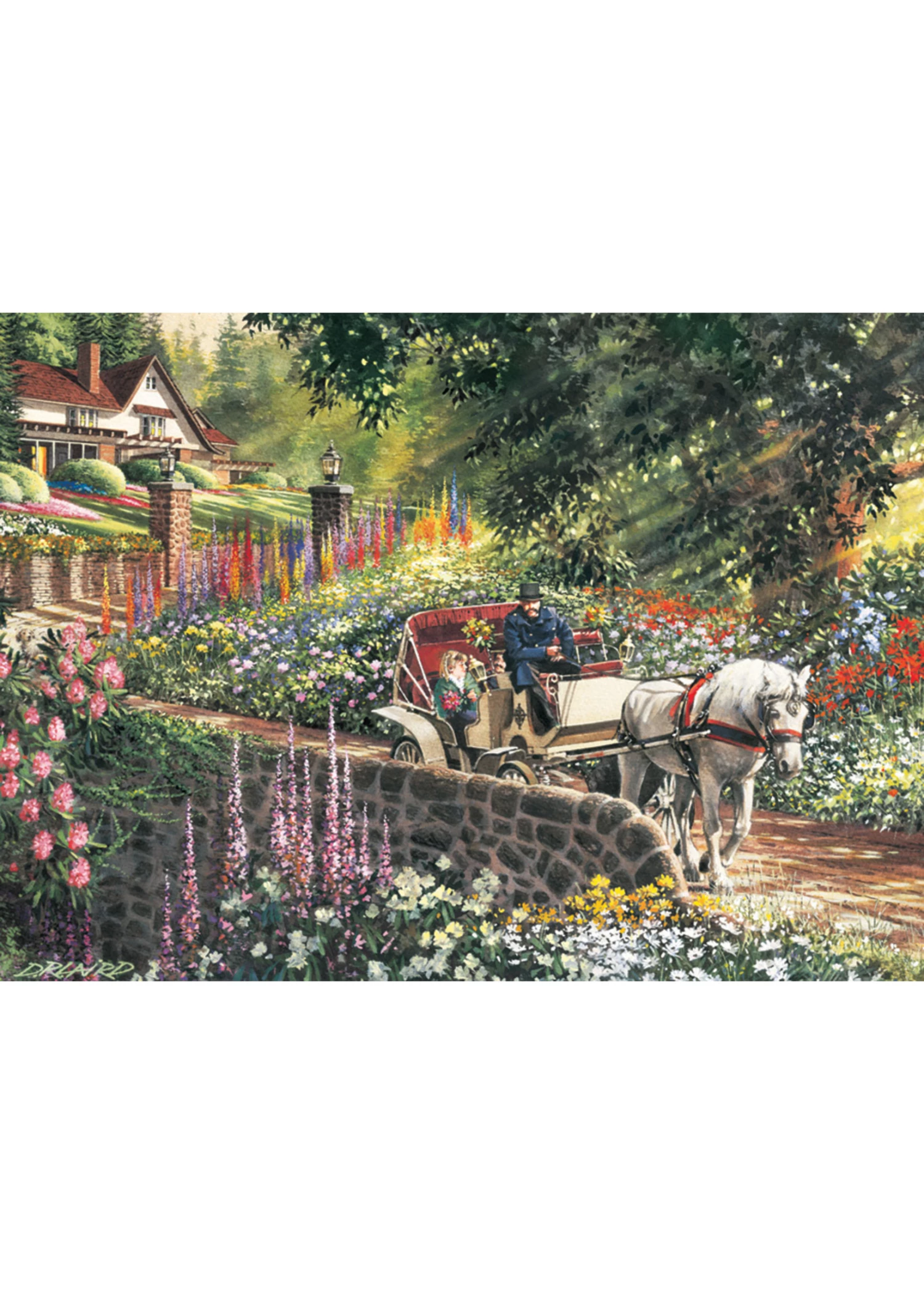 Mrs. Leon has cut fresh flowers from her beautiful garden and is taking a Carriage Ride into town to deliver them to a sick friend. A colourful Easy Handling 275 piece puzzle with large pieces.