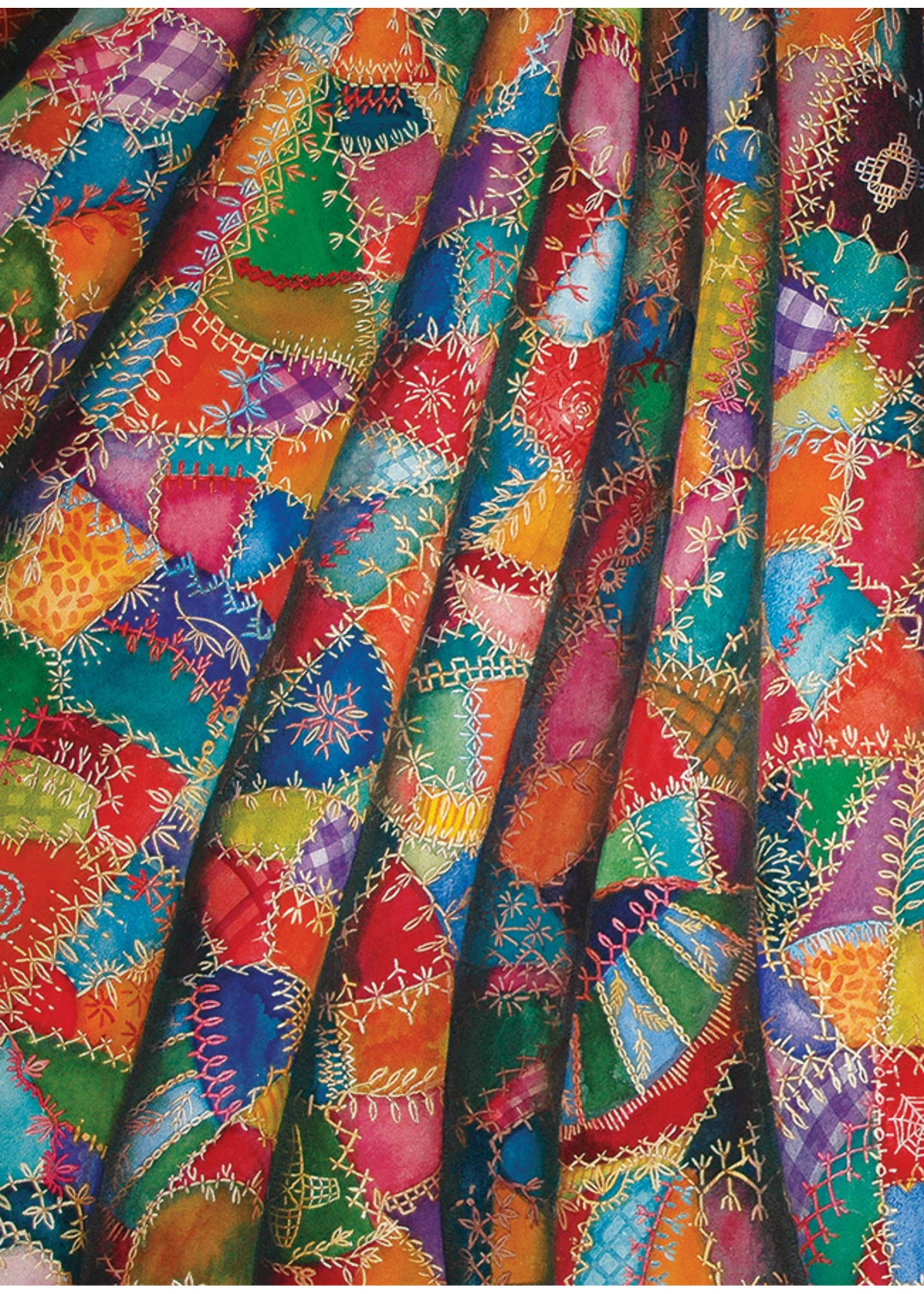 A Crazy Quilt with colorful patches of blue and red hues sewn together with intricate stitches. Take an adventure with Cobble Hill’s 1000 piece random cut puzzle that includes a reference poster.