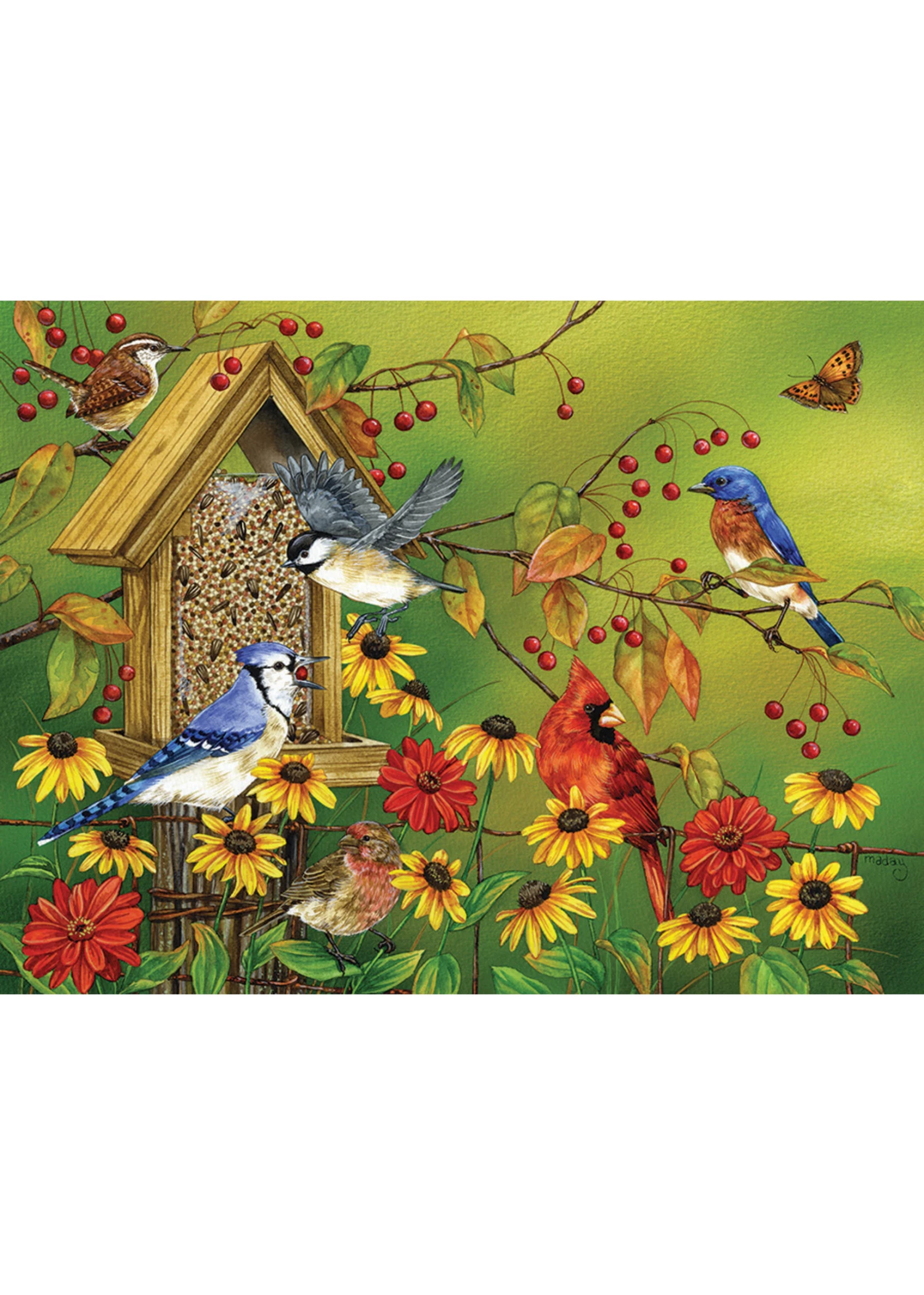 The colourful birds are enjoying a Fall Feast at the daisy farm in this Easy Handling 275 piece puzzle with large pieces.