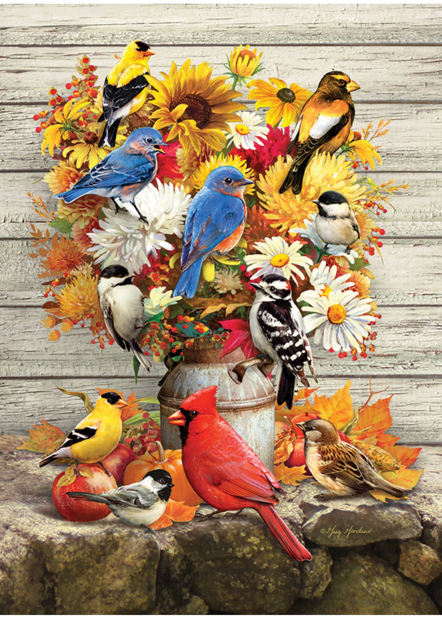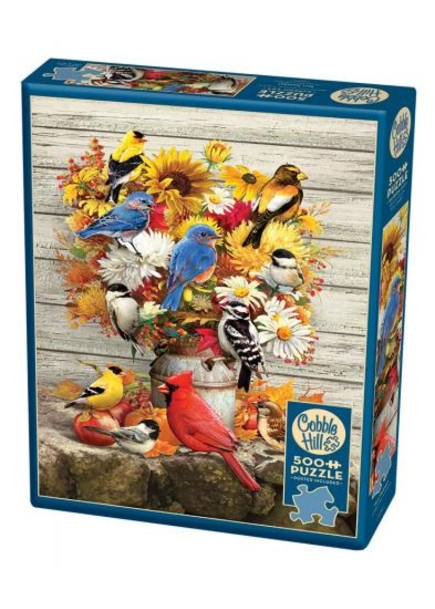The Fall Harvest bouquet is a bountiful 500 piece autumn puzzle featuring fall florals and a bevy of birds.