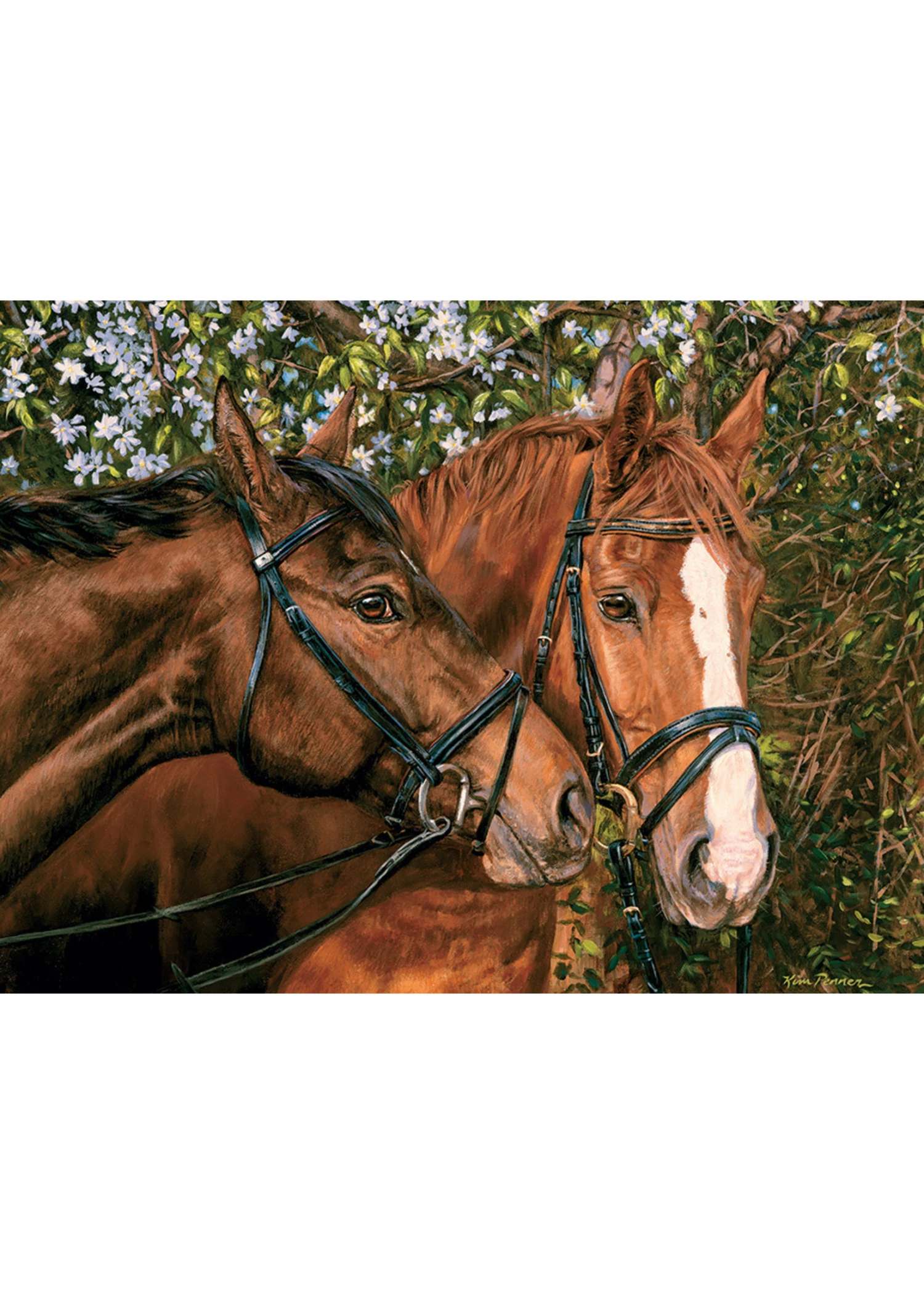 The case of ‘two heads are better than one’ rings true in Friends Forever Easy Handling 275 piece puzzle. The lovely horses nuzzle each other as they walk past their favorite flowering hedge.