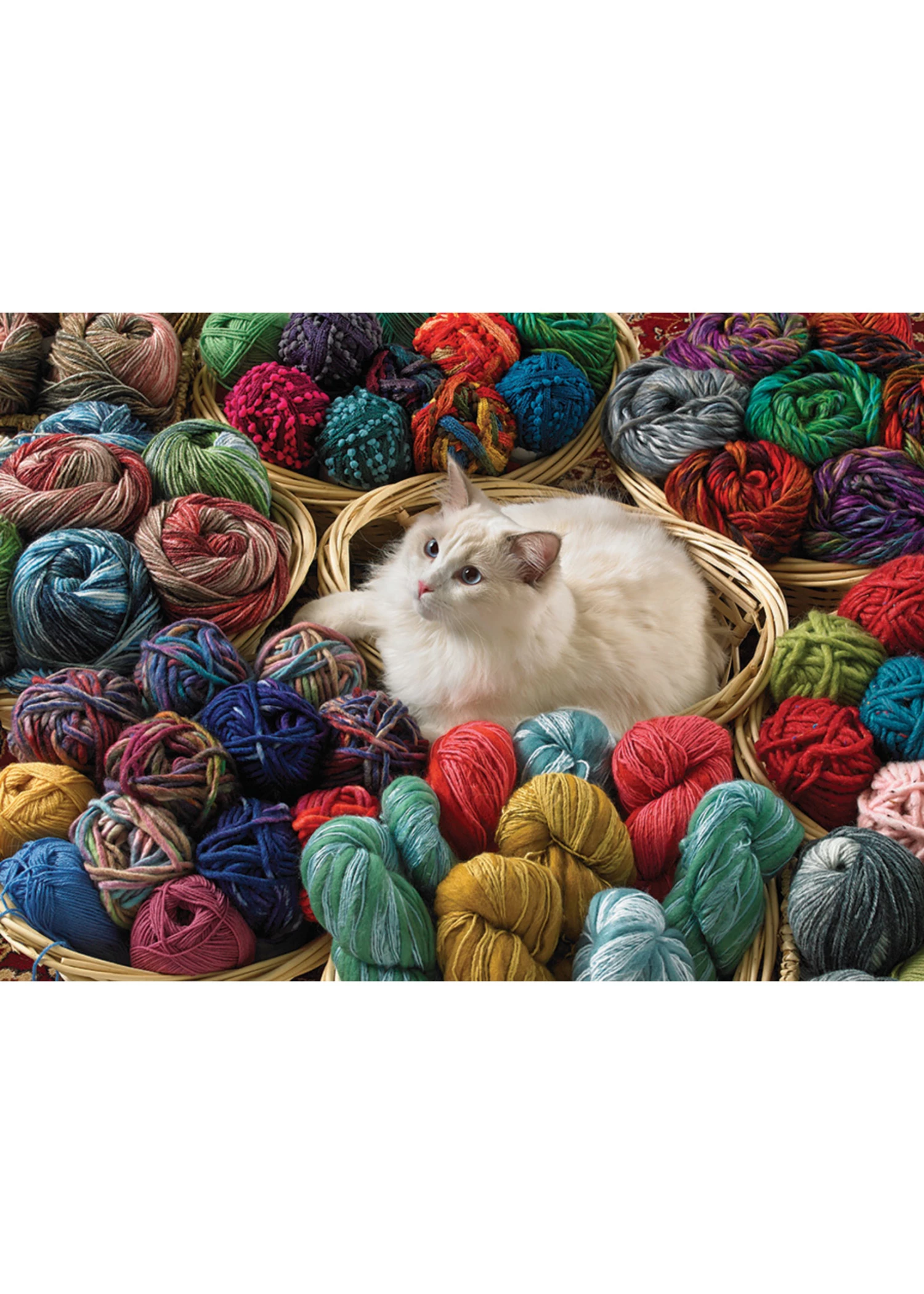 Baskets full of balls of yarn and a beautiful white Fur Ball! This adorable ragdoll cat has found himself a cozy little spot to knit.
