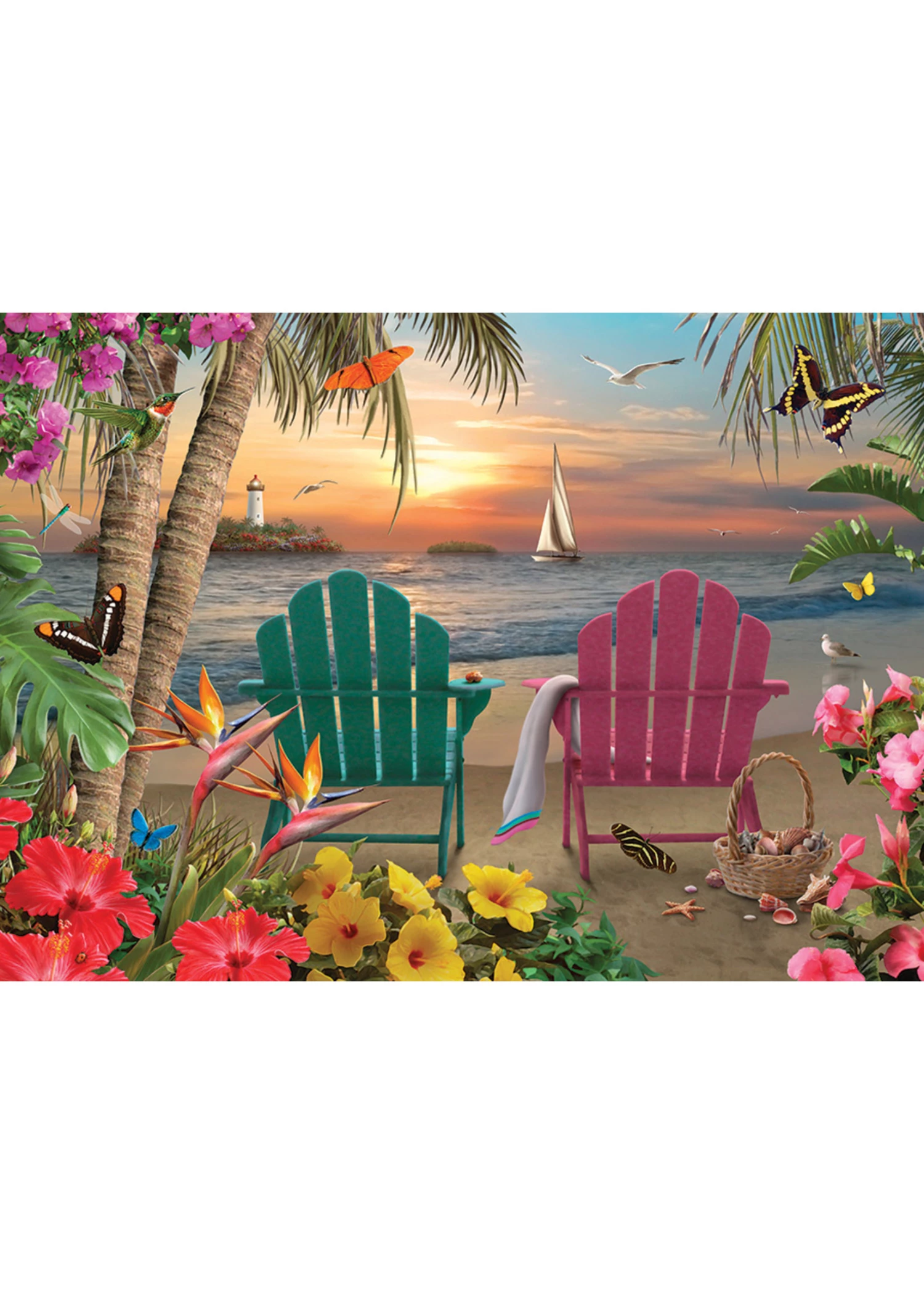 The Adirondack chairs have the perfect view of a sailboat and sunset on Island Paradise. Cobble Hill’s 500 piece puzzles have large size random cut pieces and it includes a reference poster to help in your adventure!