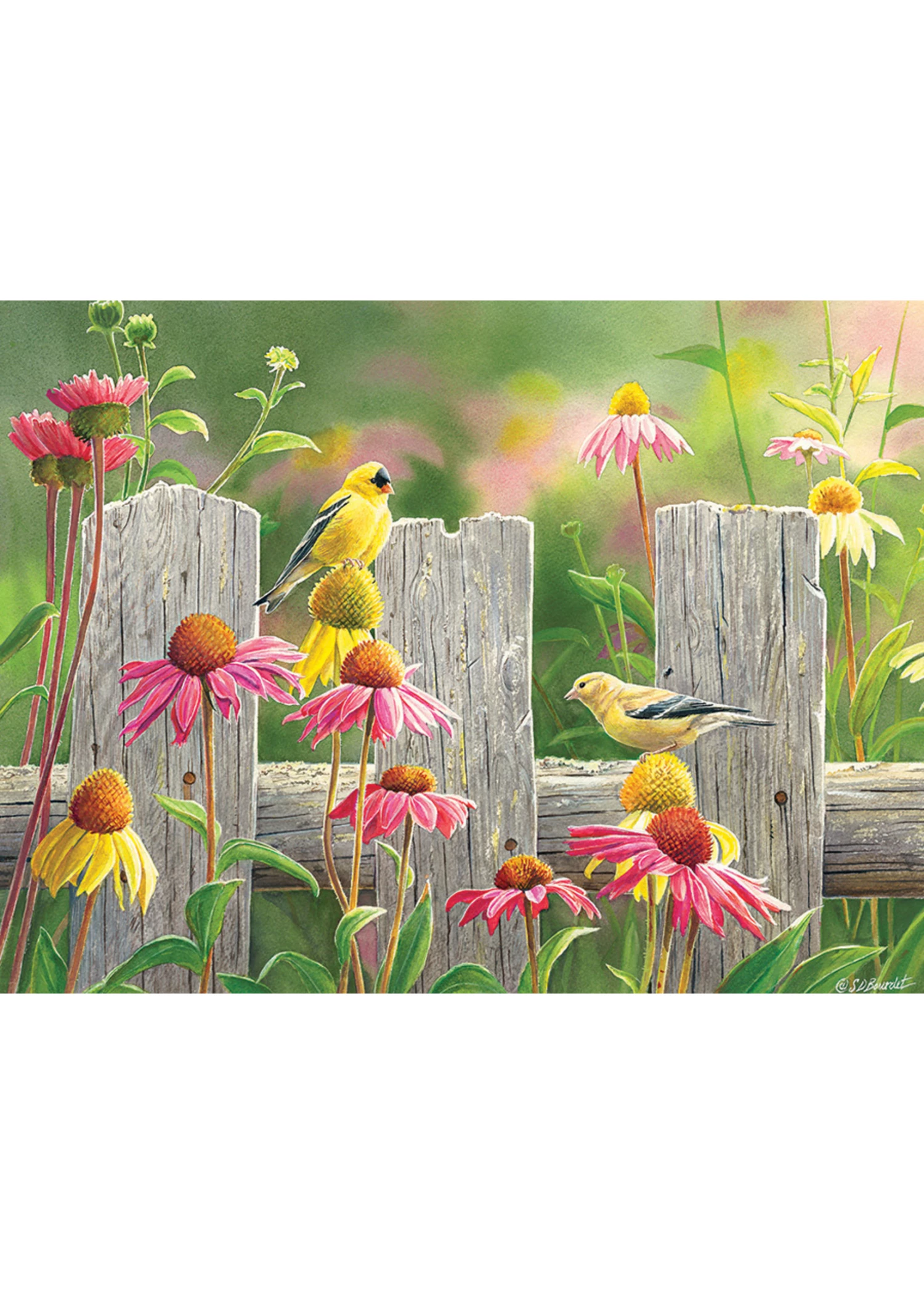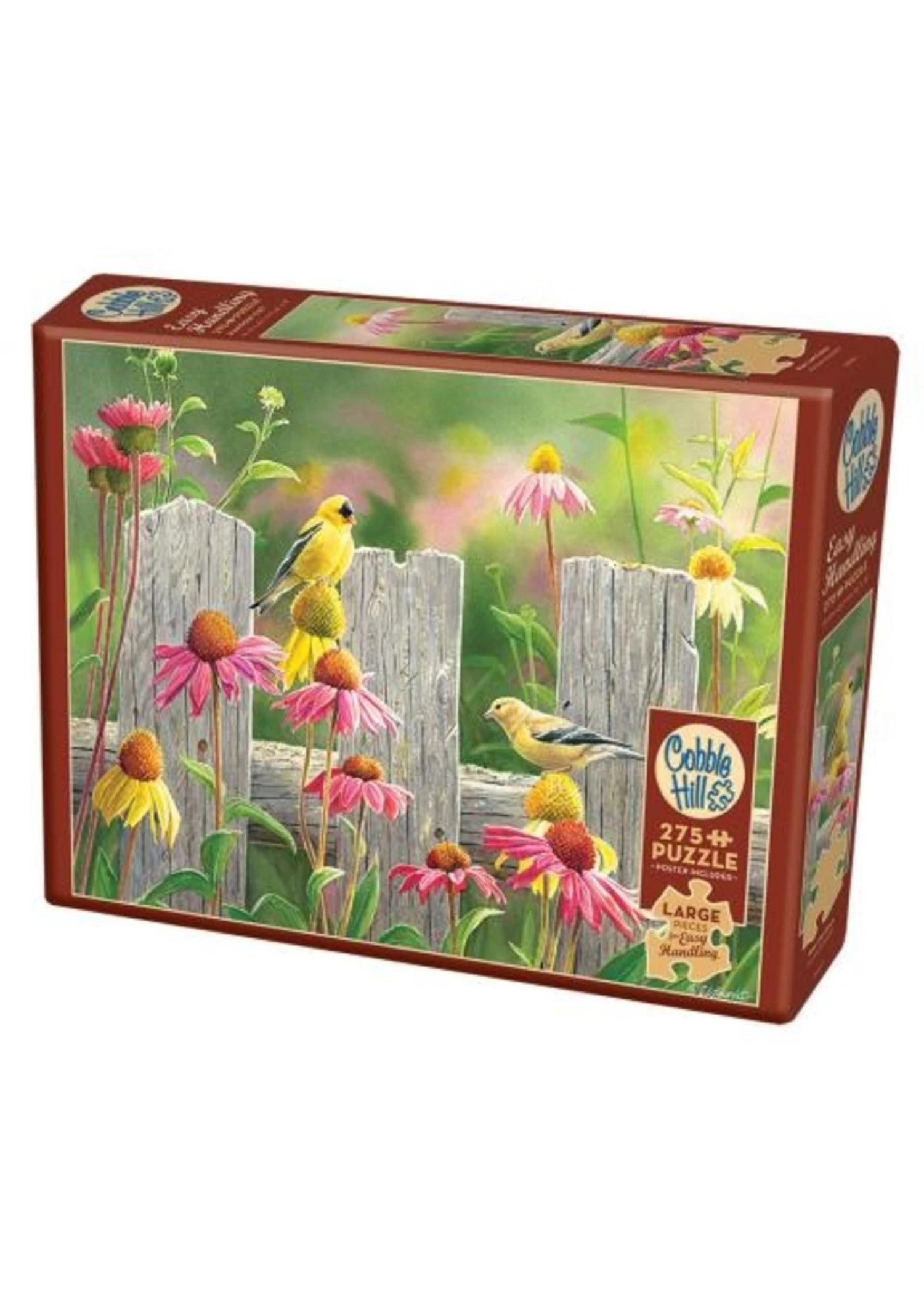 The lovely Pink and Gold flowers camouflage the resting finches perched so delicately on center stage. What song will they sing on this lovely morning? A cheerful Easy Handling 275 piece puzzle for the bird and nature lover!