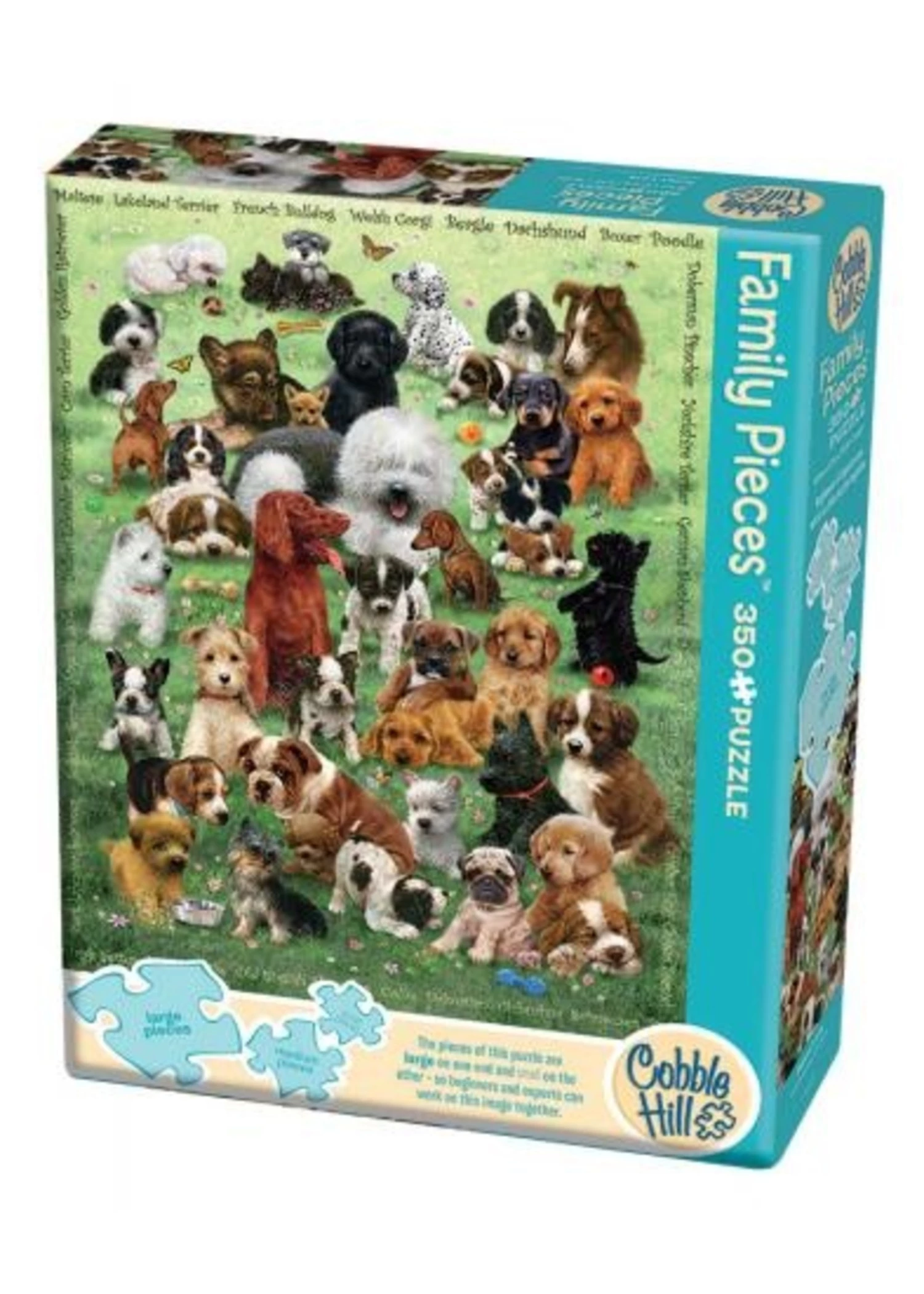 Puppy Love! Adorable puppies featured in this Family Pieces 350 puzzle will have you drooling with cuteness. Have fun matching the puppy to the breed name around the border.