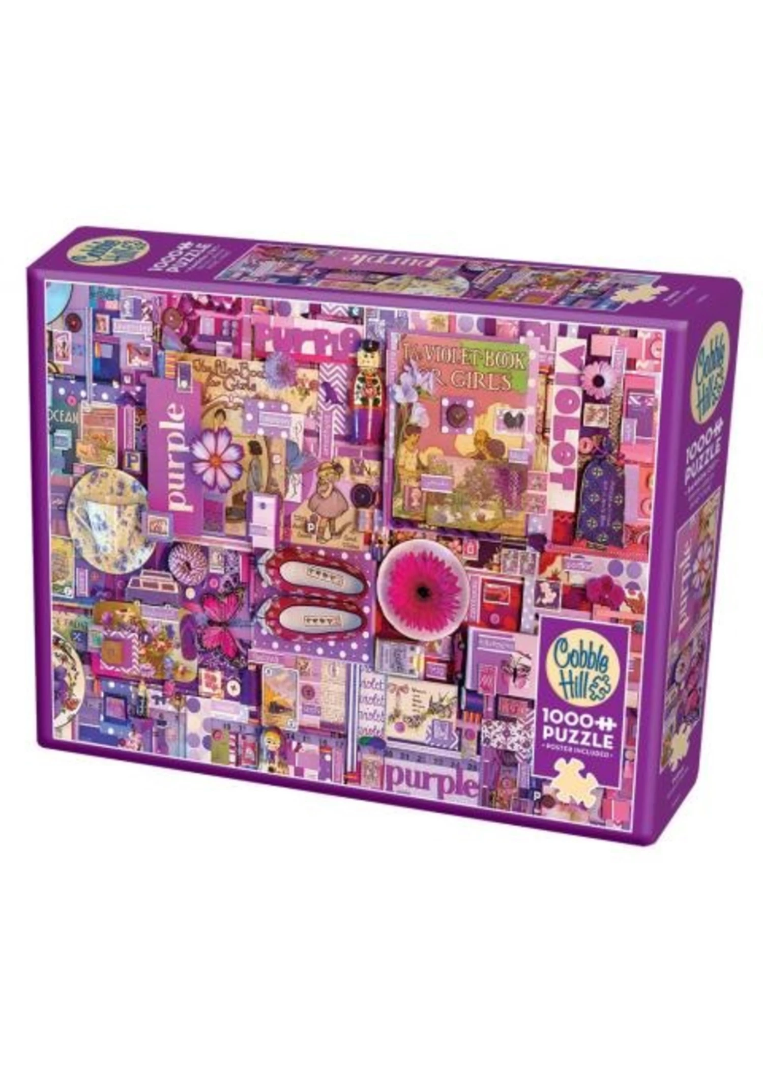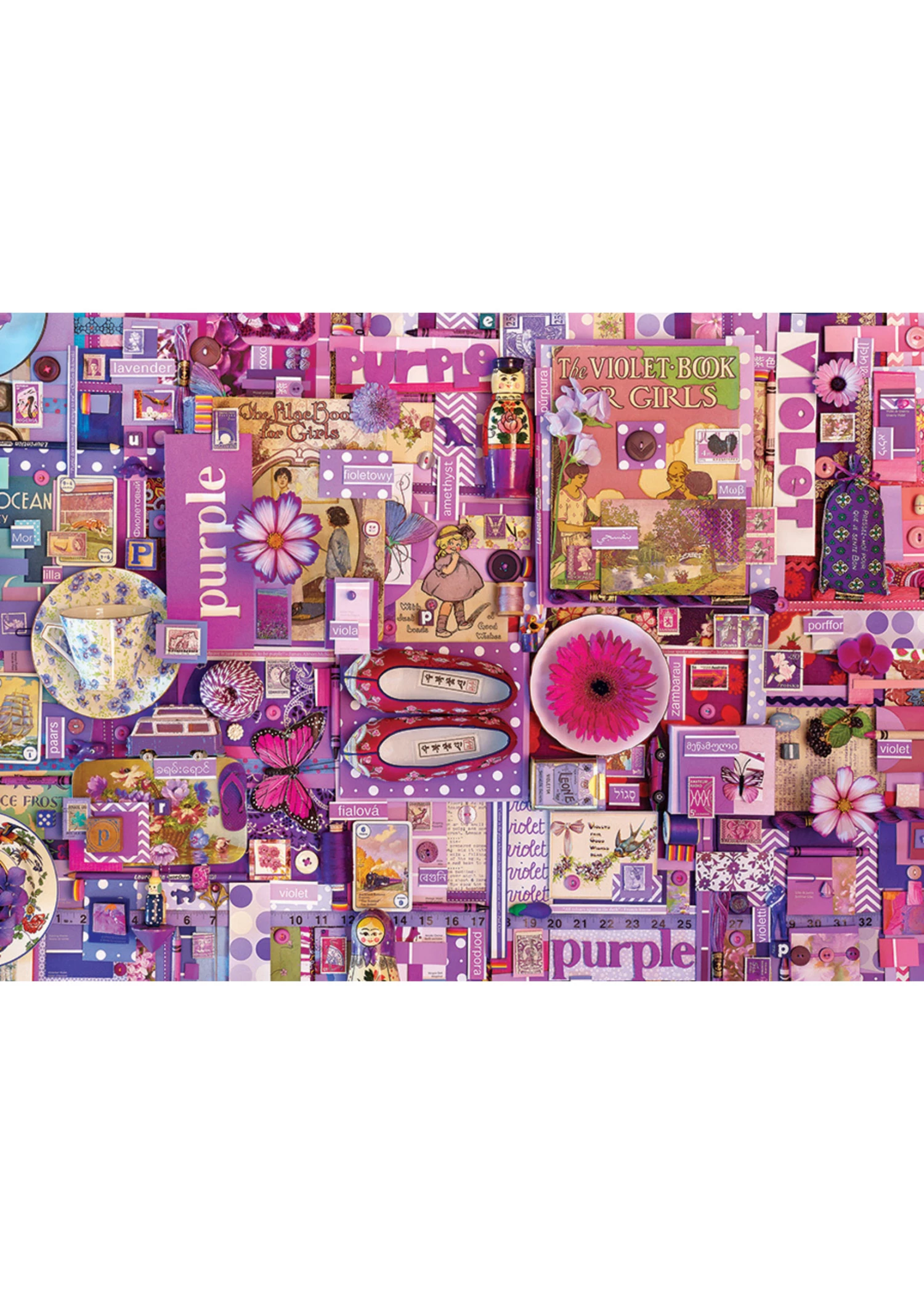 Ribbons of the word, “purple” are spelled out in multiple languages, along with vintage knick knacks and a pencil with the artist’s name on it. Purple, indigo, or violet, however one calls it, this puzzle is full of majesty.Â