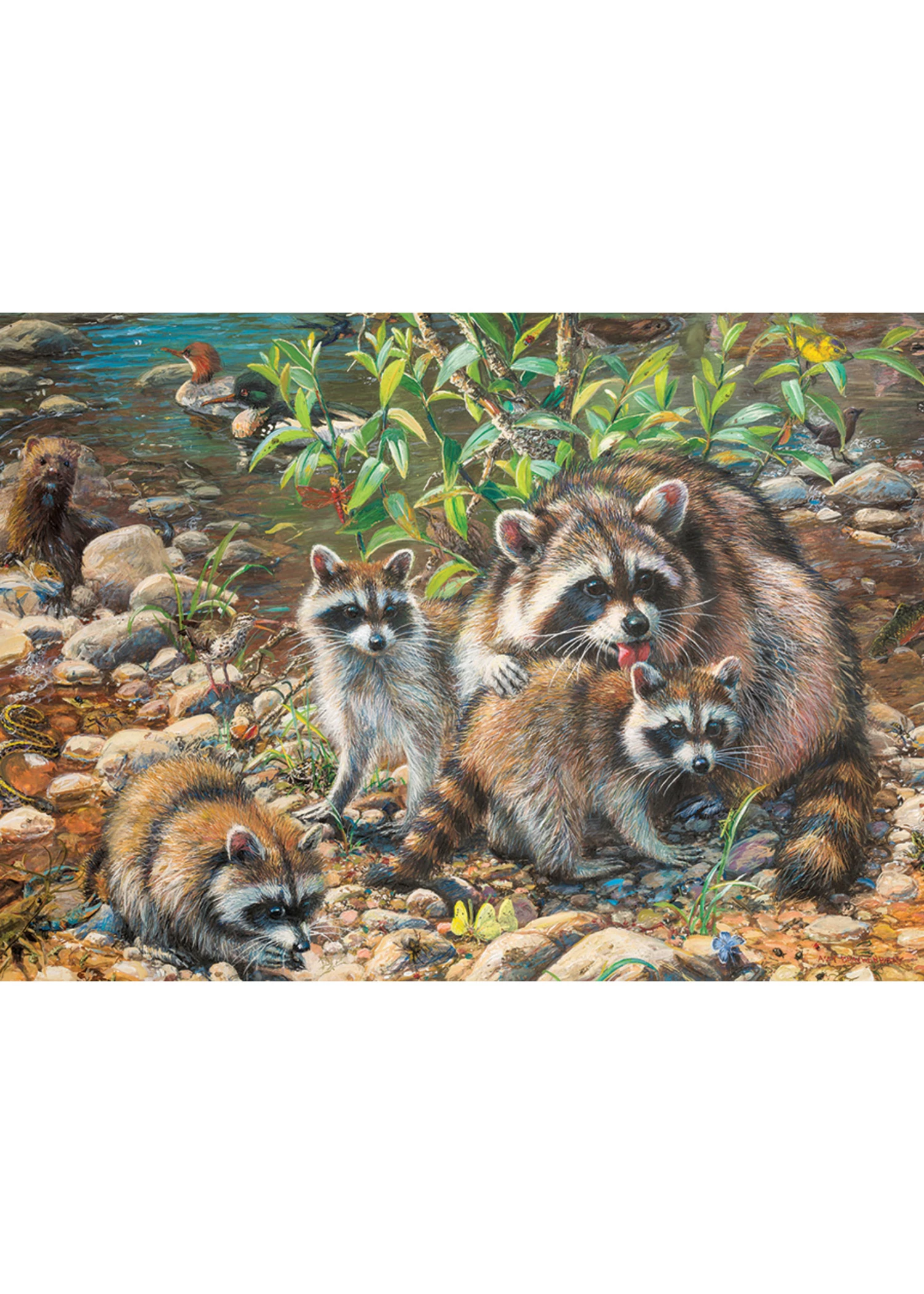 A cute band of bandits, also know as the Raccoon Family enjoy foraging in the forest, while momma coon cleans the wee one. Super adorable puzzle of wildlife to mimic the fun loving family in your home.