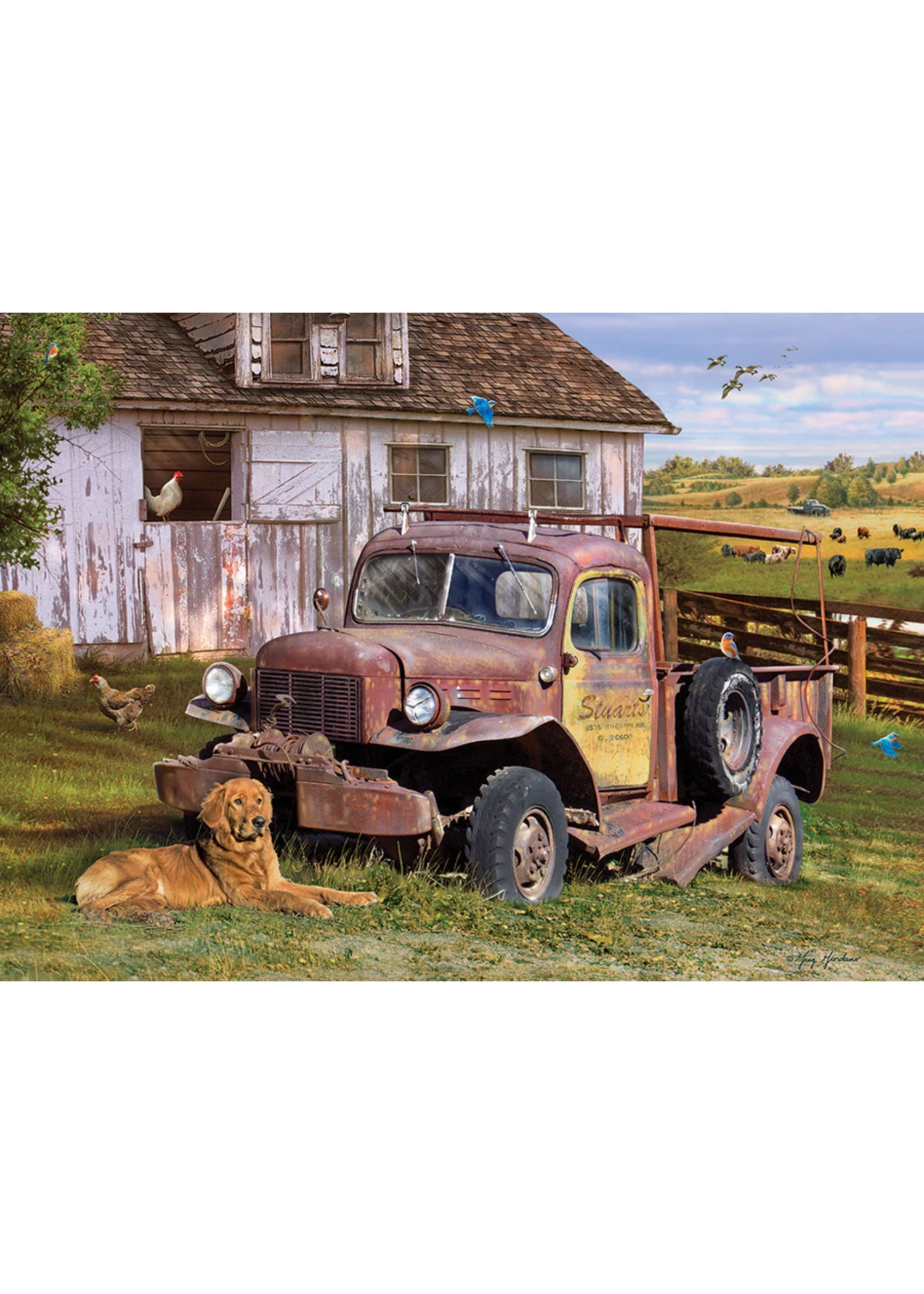 This vintage Summer Truck isn’t going anywhere in its rusted condition, so the farm dog is happy to sit in front of it as he relaxes on the farm. This 1000 piece country puzzle is sure to relax you.