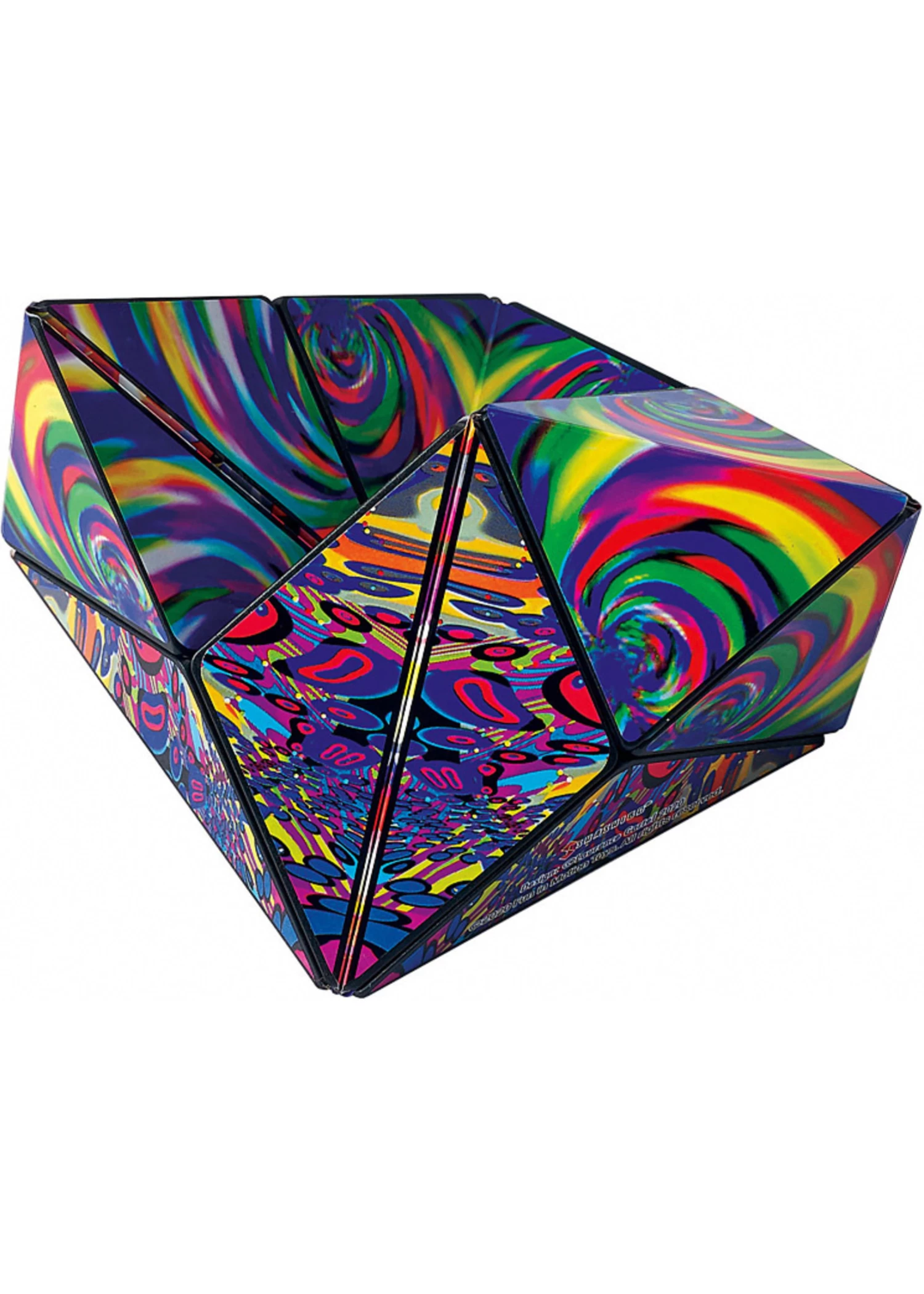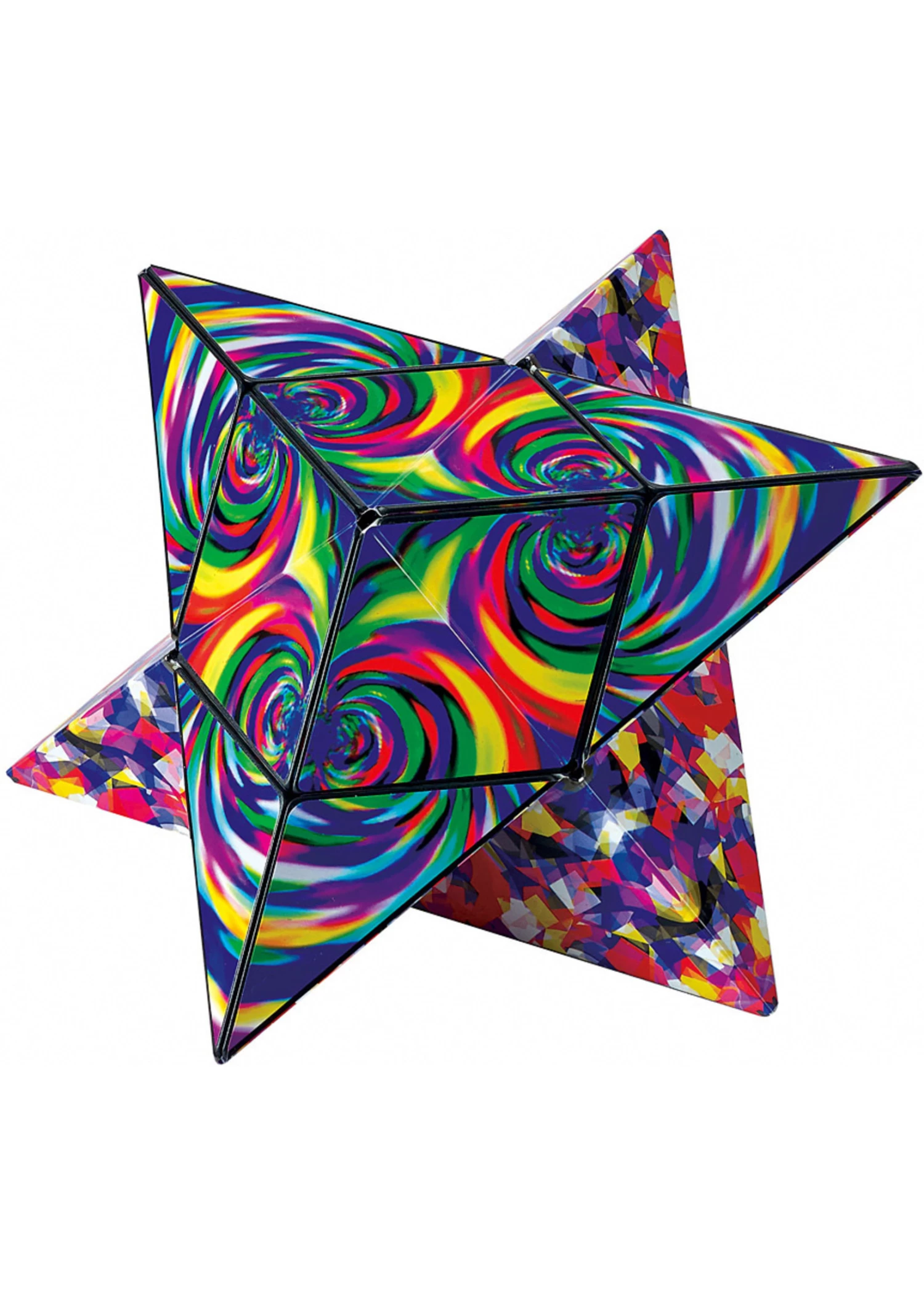 Shashibo is a shape-shifting box that incorporates strong magnets, allowing it to be combined with other Shashibo cubes for making larger sculptures and structures. Folding, captivating, complex, this beautiful magnetic art morphs into 70 different shapes. The Artist Series was designed by American Artist Laurence Gartel, considered a pioneer of digital art. Each Shashibo has 4 art designs – one outer and three inner designs. Confetti is a 2.4″ cube of red, white and purple eye-popping splotches of color. Download the Shashibo Shape Guide and see if you can master this shape-shifting puzzle.