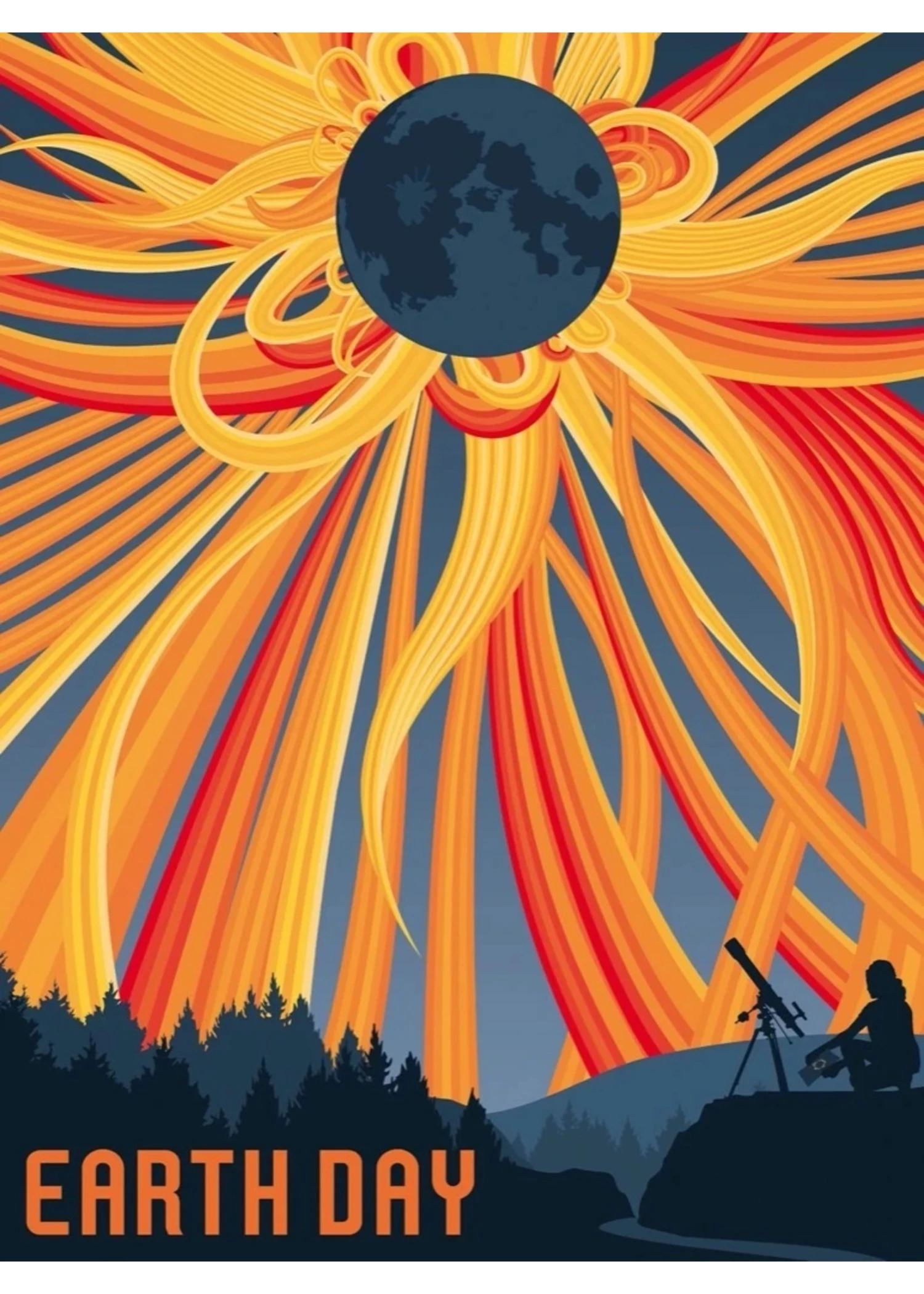 On top of a bluff we find a woman with her telescope viewing a stunning eclipse of the Moon. Fantastical sun beams shoot colorfully from around the ominously darkened Moon! Illustration Credit: NASA – Ms. Jenny Mottar/NASA Science Art Director