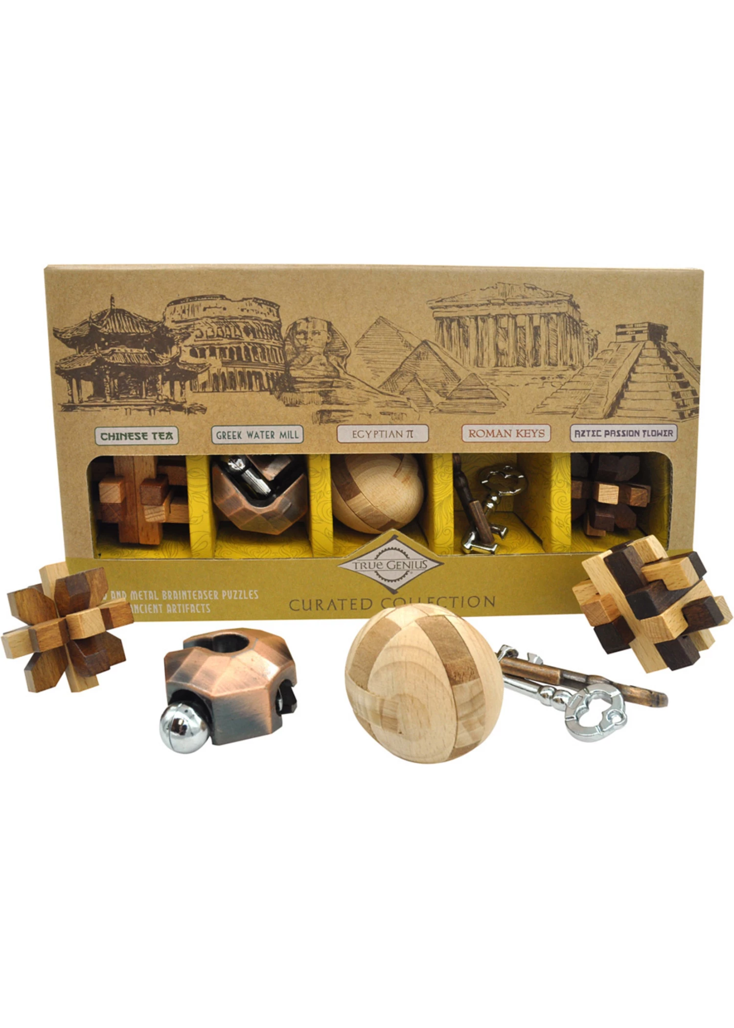 Will you crush these 5 beautiful wooden puzzles – or will they crush you? Each classic shape takes inspiration from an ancient civilization. Rome, Greece, Egypt, Aztec and China – each puzzle is solved in a totally different way, with a range of difficulty. A great gift! For 1 player.