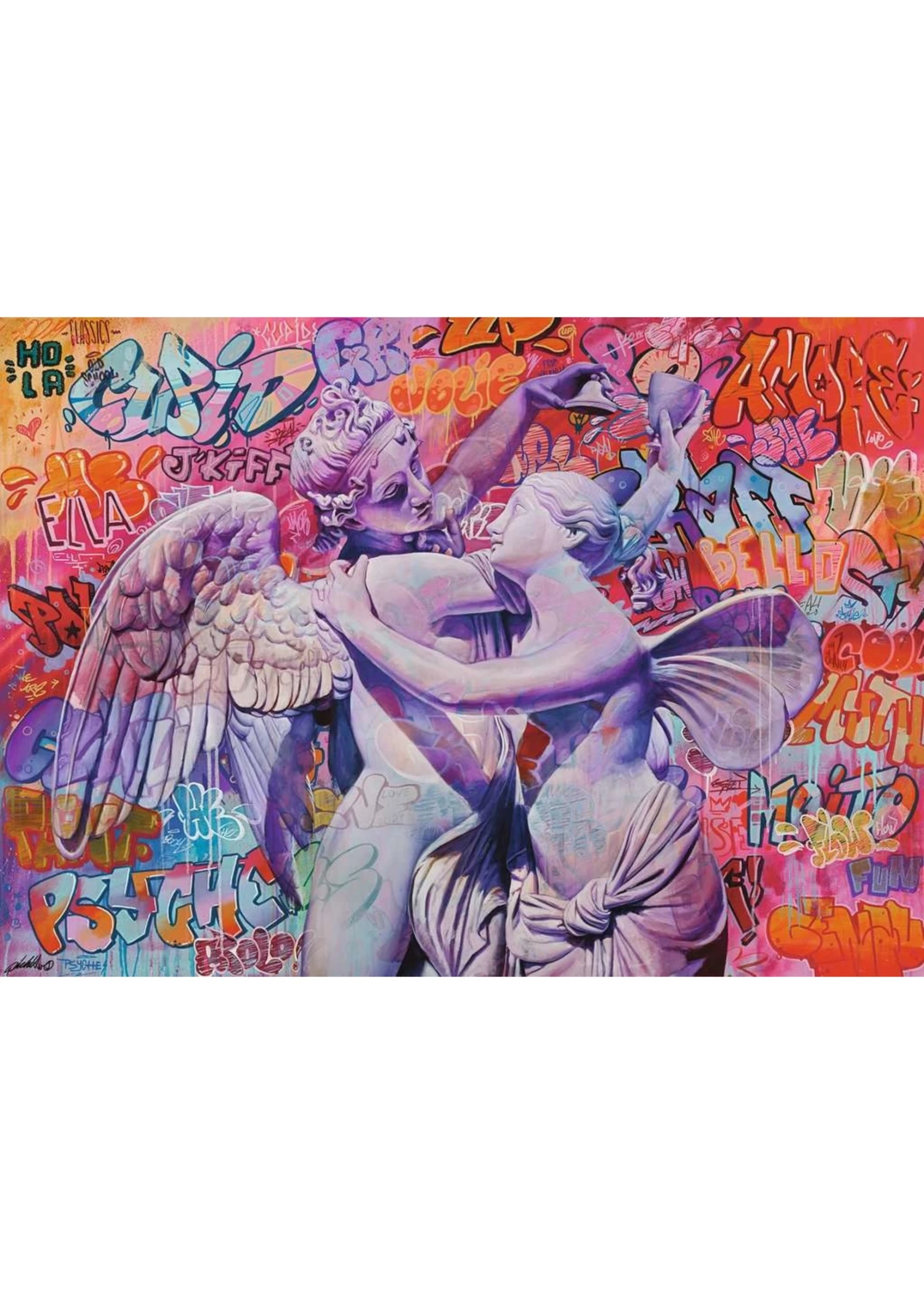 Romance is in the air with a modern twist! The fusion of raw graffiti exploding with color contrasts with images of sleek, classic sculpture — the signature style of the talented street-artist duo known as PichiAvo! Because Cupid and Psyche had to overcome many hurdles to be together, they are an enduring symbol of everlasting love. No wonder their images are so popular on Valentine’s Day cards. A perfect puzzle for your true love, or a nice treat for yourself, anytime of the year!