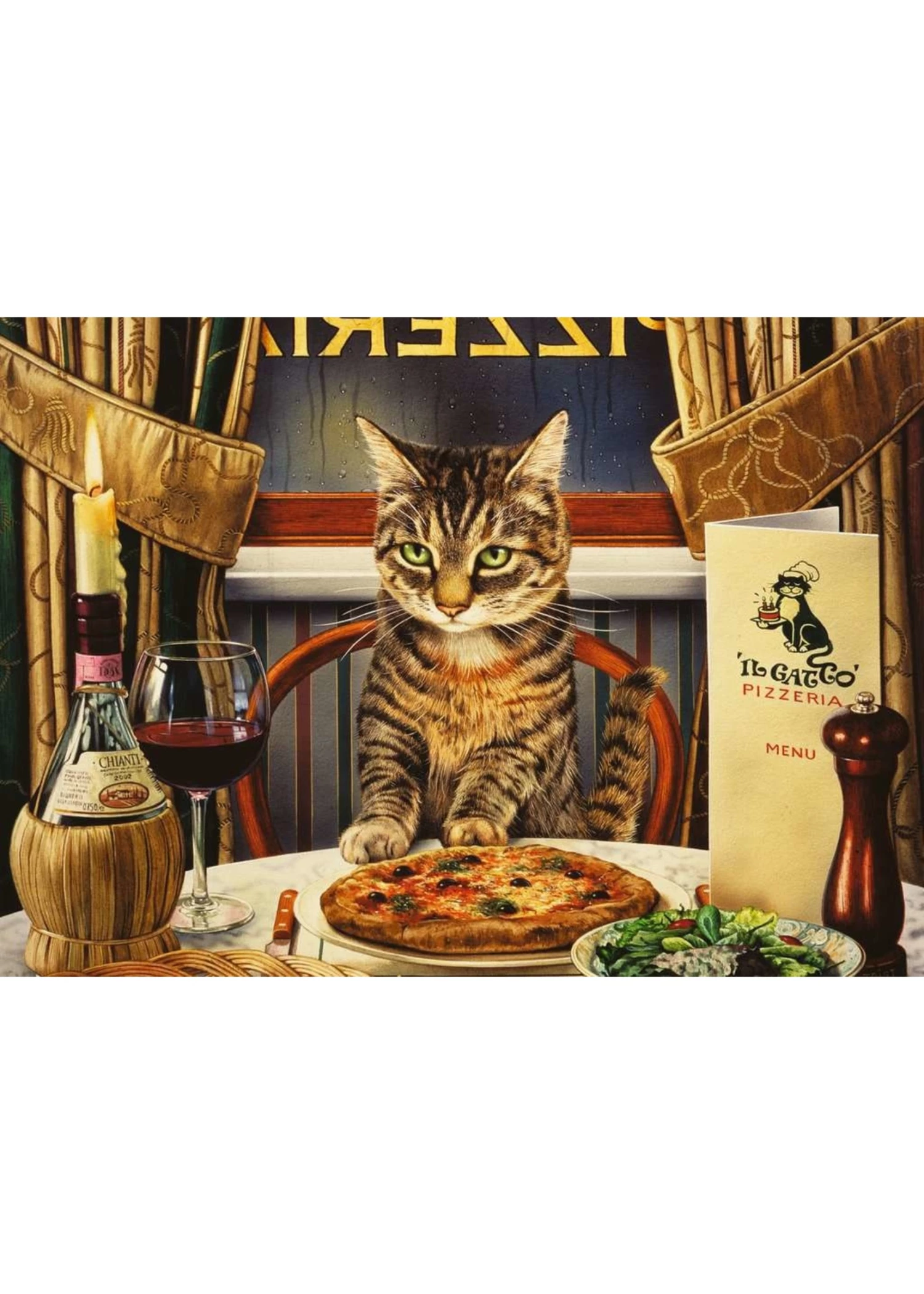 Itās a delicious pizza for one, with a thick, crunchy crust and, of course, double anchovies! Talbert the tabby is right at home at āN Gatto Pizzeria (after all, thatās Italian for āA Catā). Heās even being healthy and having a side salad! From the irreverent imagination of British artist Geoff Tristram, this illustration makes a thoughtful gift for any cat-lover. With pieces 30% larger than standard, details are easy to see, so you can complete the puzzle in just an evening or two!