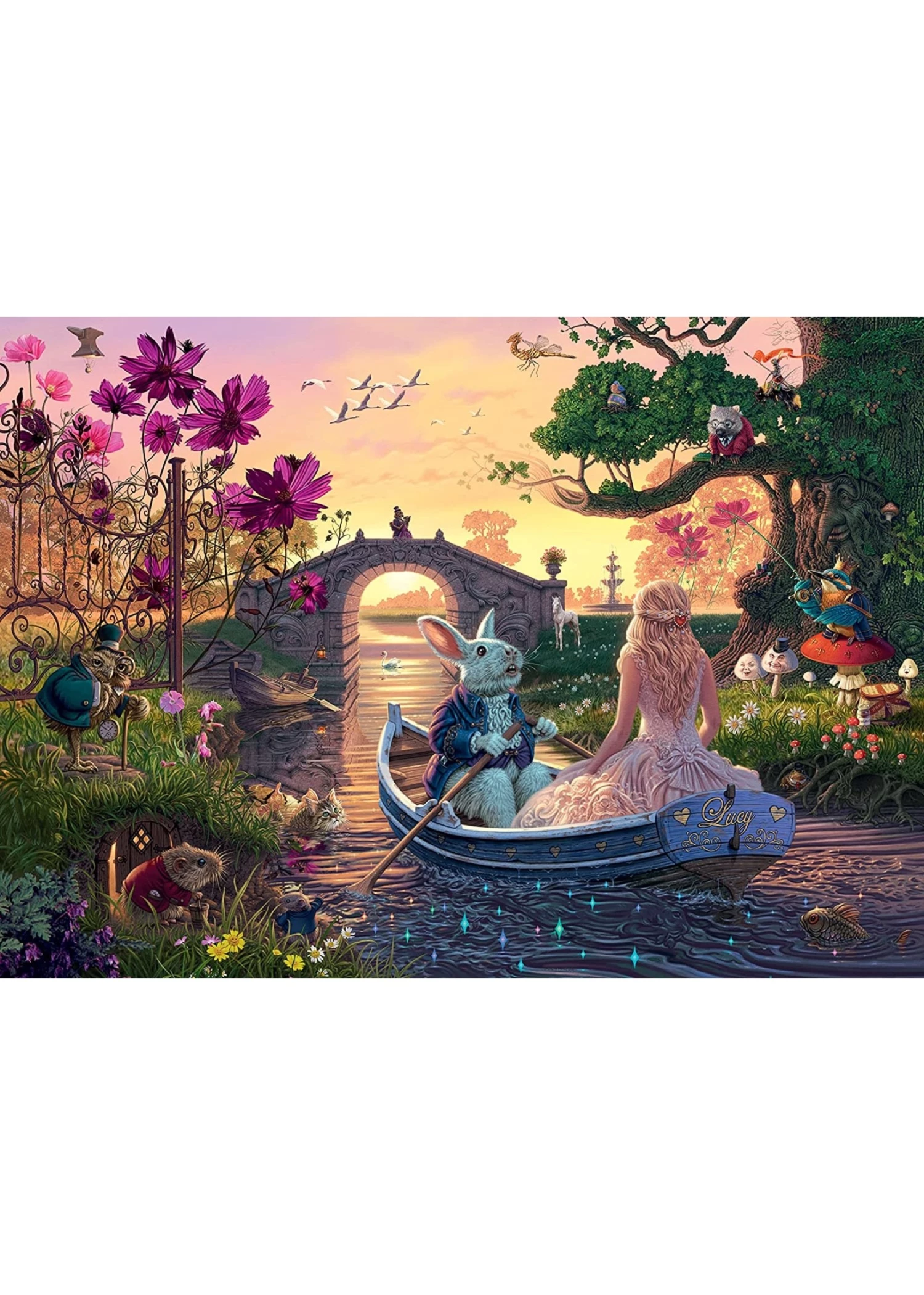 Take a boat ride down a sparkling stream in the land of milk and bunnies! The white rabbit carefully rows lovely Lucy to her destination, while a catfish, critters and happy daisies look on. Artemis Owl wisely keeps track of the time as His Royal Highness Kingfisher dips his line, looking for a bite. Artist Steve Read has cleverly hidden 16 rabbits in his design — can you find them all? A lavishly-illustrated puzzle inspired by famous literary works, perfect for any lover of fantasy fiction!