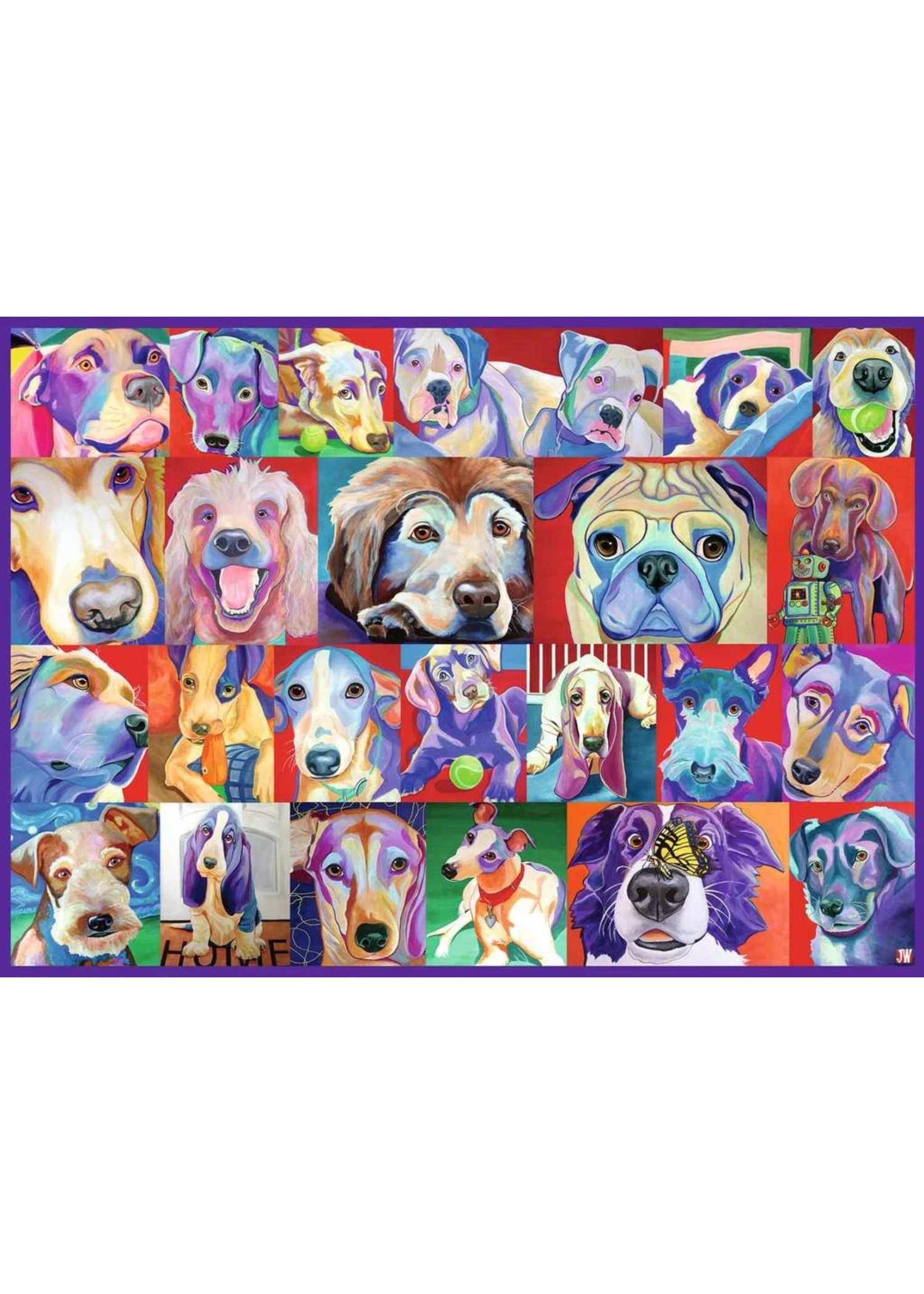 Look at those faces! Every dog lover knows our canine companions enrich our lives in countless ways. Artist Jodi Wright brings you this bright collage of endearing pooches’ faces in our “Hello Doggie” puzzle. A lifelong pet-lover and champion of rescue animals, Jodi shares, “It is my hope that, through the boldness of color and the empathy of such faces, I can tempt others to stop and take a closer look at wagging tails and hopeful hearts.”