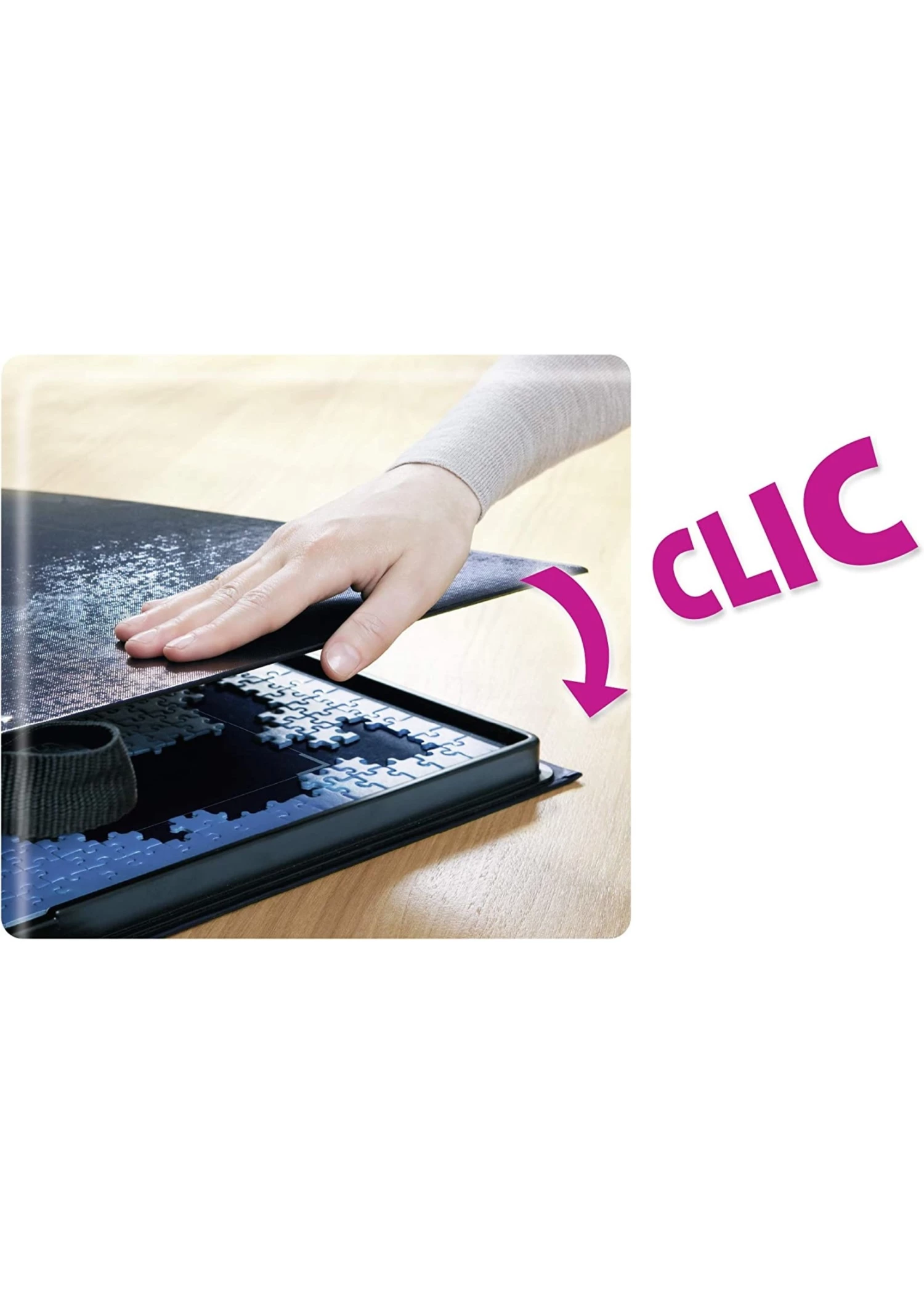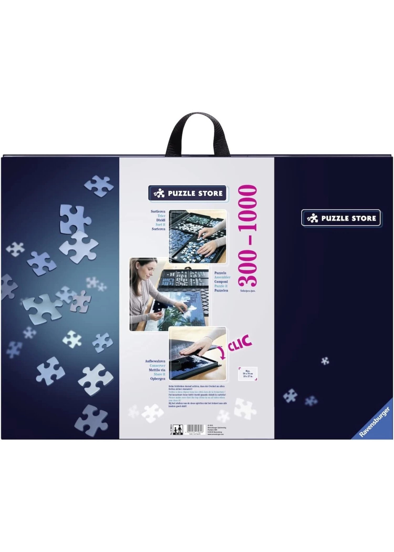 Easily sort pieces within the five integrated trays then build your puzzle on the included puzzle base – it will easily fit 500 and 1000 piece puzzles. For convenient storage and transport of your puzzle, simply place the puzzle base on the sorting trays and snap the lid closed. Your loose pieces will stay in their compartments and your in-progress puzzle stays in place – even when upright!