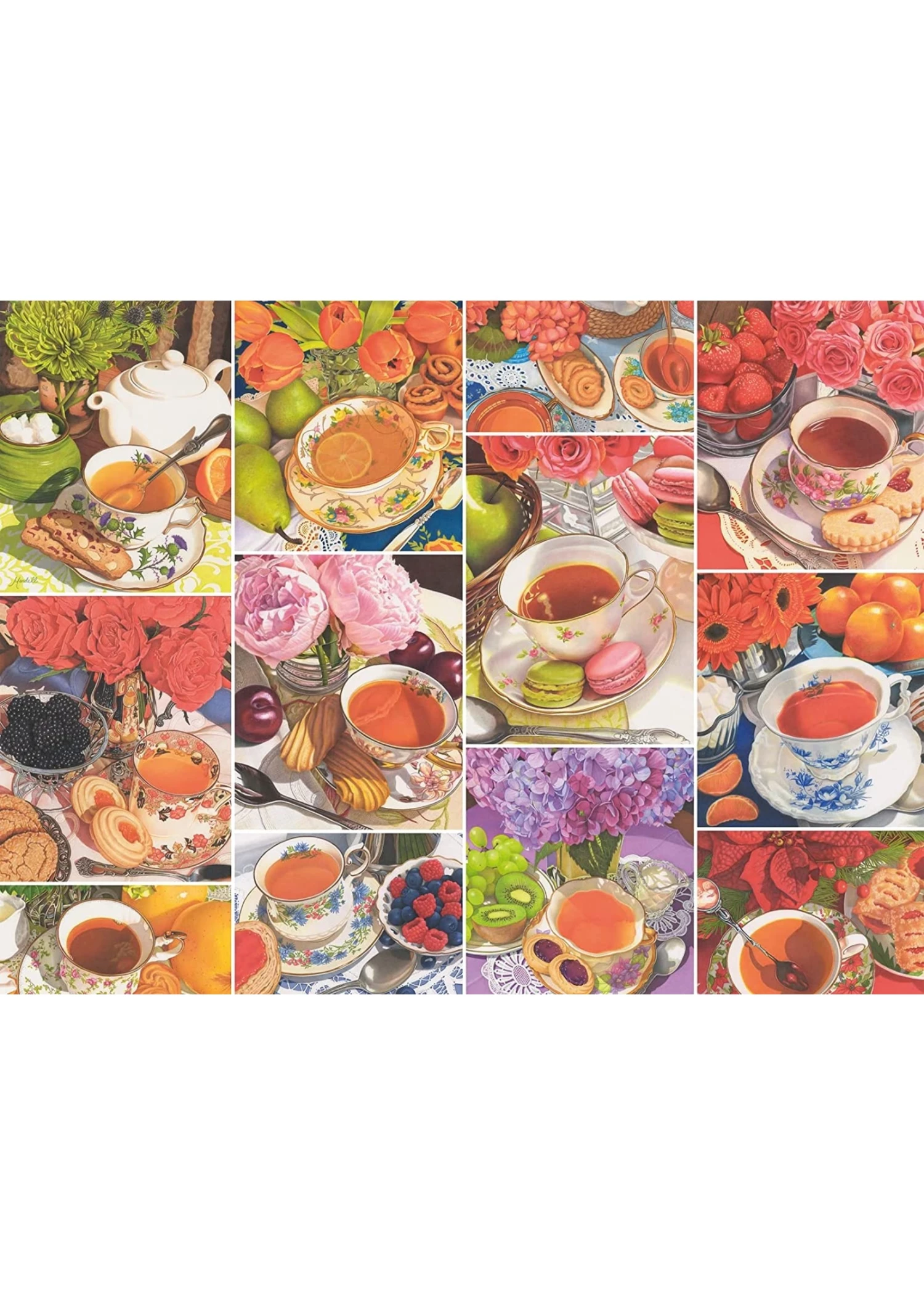 Whether you prefer the sweetness of fruit teas, the exotic spices of chai, or a hint of citrusy bergamot in Earl Grey, you’re sure to love this charming collage! Our illustration includes delicious treats like Linzer cookies, madeleine, biscotti, French Macarons, shortbread, and more. And beautiful blooms — hydrangeas, roses, peonies, poinsettias, tulips, Gerbera daisies — complete each inviting scene. Take a break with a soothing cup of tea as you piece together this delightful puzzle!